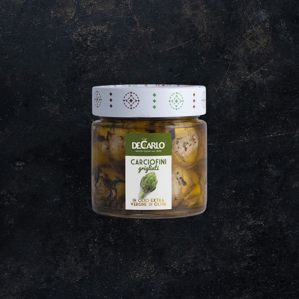 I Carciofini Grigliati De Carlo sono realizzati con carciofi varietà “Violetto di Brindisi” 100% italiani, coltivati in terreni selezionati e lavorati entro 24 ore dalla raccolta per preservarne croccantezza, colore e profilo aromatico. Conservati in olio extravergine d'oliva pugliese, aglio, menta, peperoncino e un leggero tocco di aceto, questi carciofini sprigionano sapori intensi e tipicamente mediterranei.