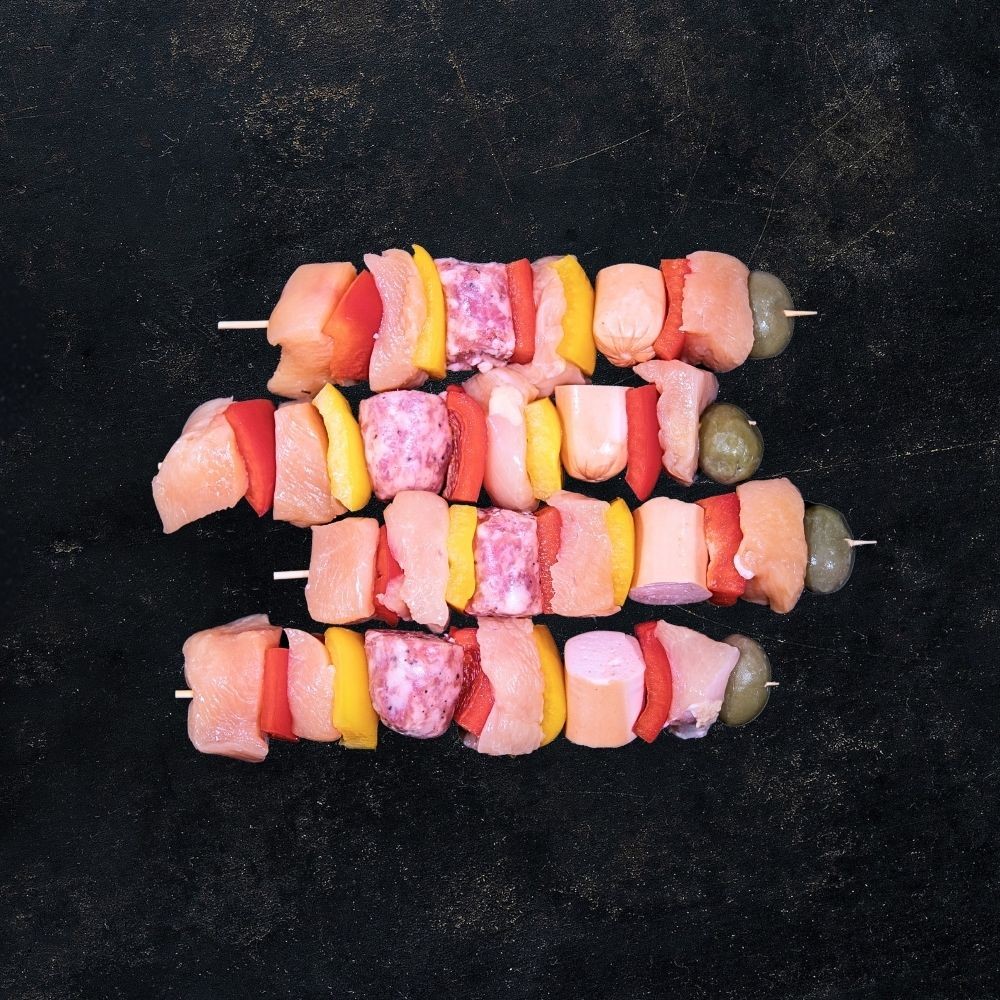 Pollo; Salsiccia selezione Comand (Carne di suino; Aroma Premix salsiccia natural (Sale 50 %; Destrosio; Supporti: fibra vegetale alimentare (bambù); Regolatori di acidità: E262; Antiossidanti: E300; Aromi naturali); Pimento; Pepe; Aglio); Wurstel Nocker (Carne di suino 81%; Acqua; Sale; Farina di piselli; Estratti di spezie; Regolatori di acidità: citrato di sodio. Spezie; Antiossidante: acido ascorbico. Aroma; Conservante: nitrito di sodio); Peperoni; Olive verdi.