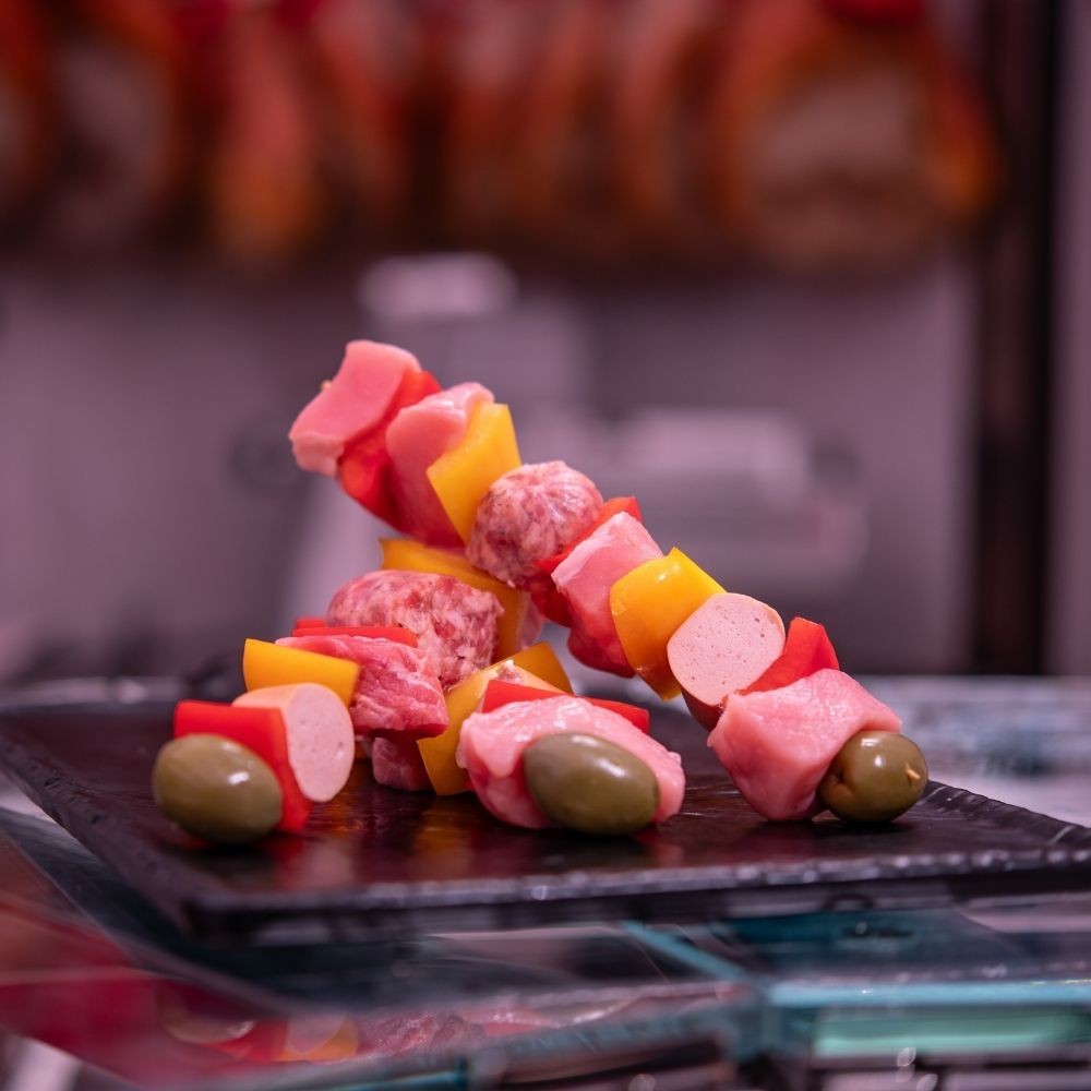 Carne di suino; Salsiccia selezione Comand (Carne di suino; Aroma Premix salsiccia natural (Sale 50 %; Destrosio; Supporti: fibra vegetale alimentare (bambù); Regolatori di acidità: E262; Antiossidanti: E300; Aromi naturali); Pimento; Pepe; Aglio); Wurstel Nocker (Carne di suino 81%; Acqua; Sale; Farina di piselli; Estratti di spezie; Regolatori di acidità: citrato di sodio. Spezie; Antiossidante: acido ascorbico. Aroma; Conservante: nitrito di sodio); Peperoni; Olive verdi.