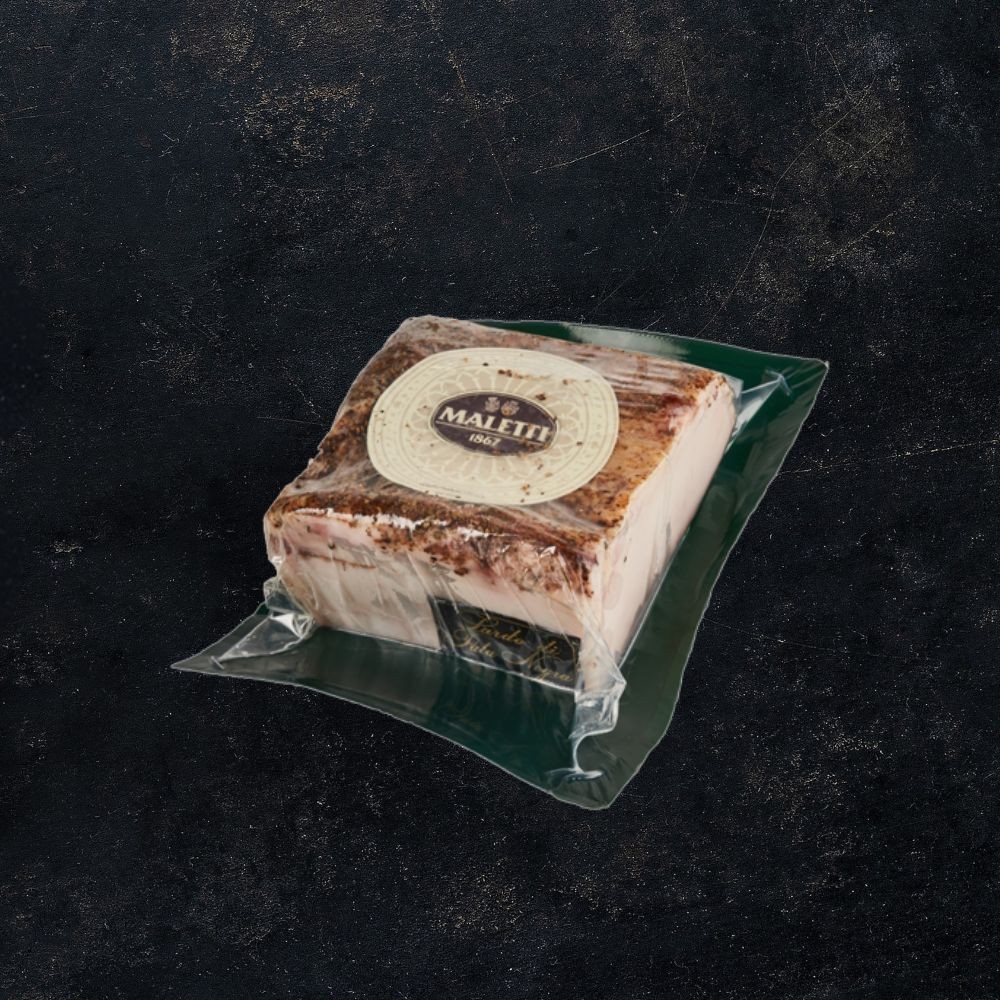 Il Lardo di Pata Negra Maletti è una prelibatezza ottenuta da suini di razza iberica allevati allo stato brado e alimentati con ghiande ed erba. Viene lavorato secondo un’antica tecnica spagnola: la concia lenta e naturale la rende ideale per esaltare la dolcezza e la texture burrosa del grasso.